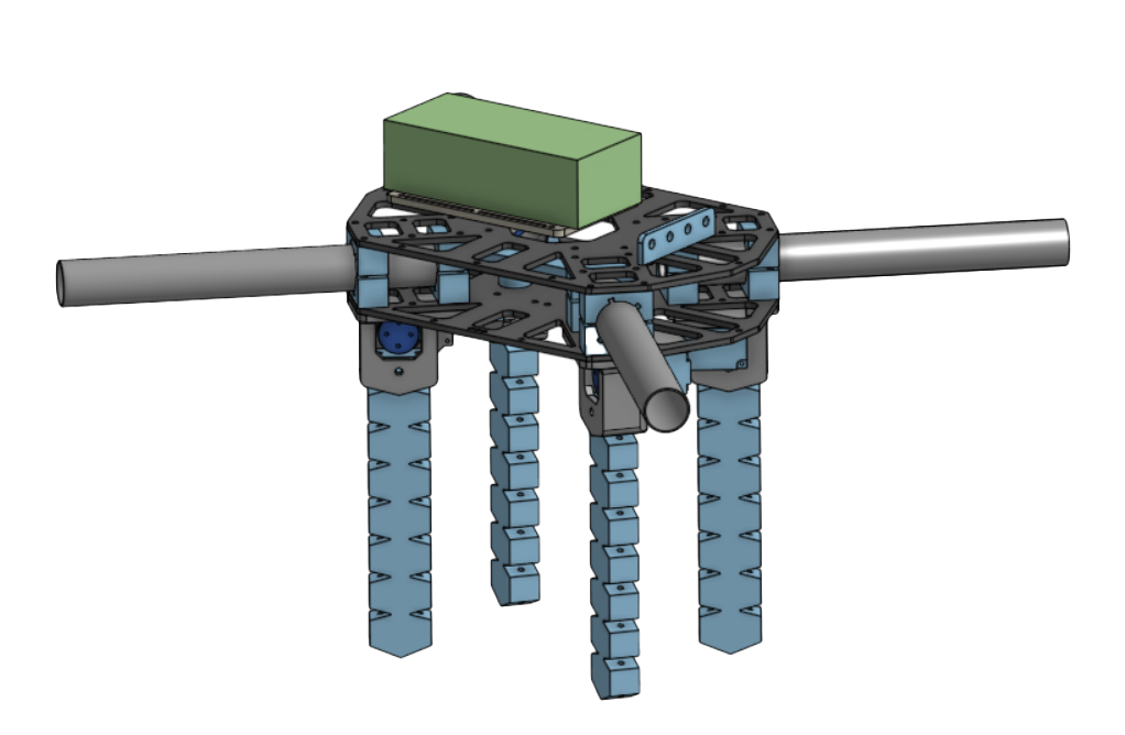 Assembly of the drone frame: The four grippers are visible, with mounts for servos that spin a pulley to contract the arms: