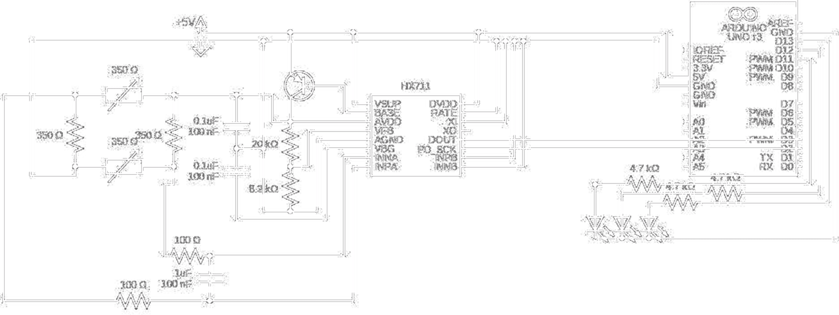 Full circuit diagram showing the Wheatstone bridge at left, LED indicator connections, and reassembled HX711 circuitry.