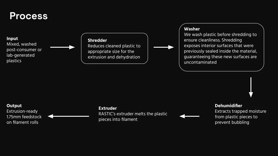 Objective: take moist, dirty plastic, convert it into usable 3D printer filament and heat-pressed sheets.