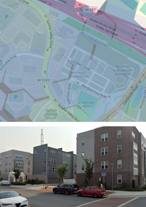 Figure 1: An instance of modern urban development lacking green space—correlating with low vegetative health and higher temperatures despite having the same population density as the neighboring town, Reston.