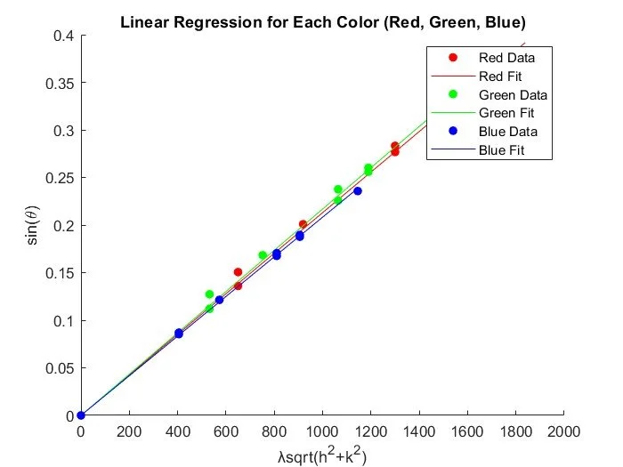Linear regression plot of lattice constant calculation for different wavelengths